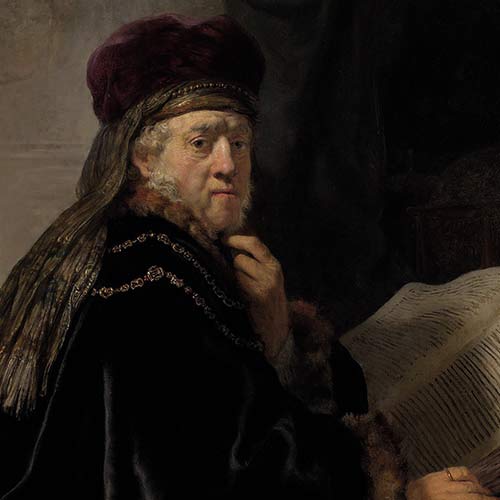 Portrait : Pas d’image connue. Rembrandt van Rijn, « Erudit assis à son bureau », coll. Galerie Nationale de Prague.