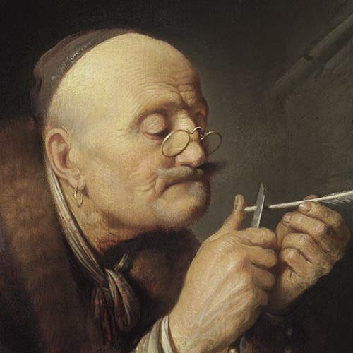 Portrait : : Pas d’image connue. Gerrit Dou, « Scholar sharpening a quill pen », v. 1630-1635, coll. The Leiden Collection, New York.